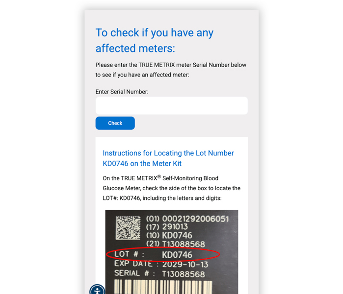 Trividia Health, a major manufacturer in the diabetes testing device industry, issued a product recall after identifying defects in select glucose meters. To support affected customers and reduce friction during the recall process, the company needed a simple, reliable way for users to determine whether their device was impacted. I developed a responsive, browser-based recall lookup tool that allows customers to check their meter’s status by entering a serial number.